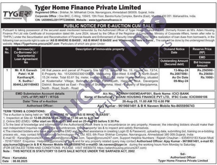 All that peace and parcel of Property Site No. 13. Janjar/SI No. 19, House No. 13/14, E-Property No. 151200502300100018, Measuring East-West 5.4864 X North-South 15.24 meter, Total 83.61 Sq. meter, Including 83.61 Sq. meter House/Building, situated at Koatemallur Village, Belimallur Village Panchayath, Hannalli Taluk. Davangere District. Bounded as East-Property of Shanthamma, West-Property of Manjulamma North-Road, South - Road