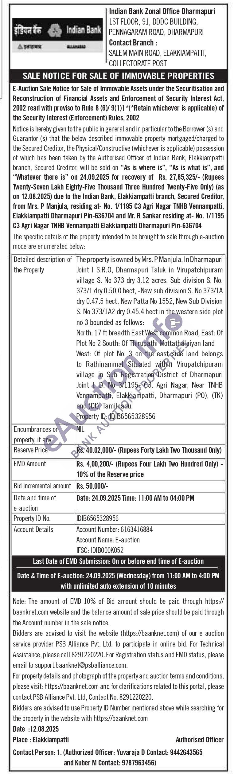 The property is owned by Mrs. P Manjula, In Dharmapuri Joint I S.R.O, Dharmapuri Taluk in Virupatchipuram village S. No 373 dry 3.12 acres, Sub division S. No. 373/1 dry 0.50.0 hect, -New sub division S. No 373/1A dry 0.47.5 hect, New Patta No 1552, New Sub Division S. No 373/1A2 dry 0.45.4 hect in the western side plot no 3 bounded as follows: North: 17 ft breadth East West common Road, East: Of Plot No 2 South: Of Thirupathi Mottathalaiyan land West: Of plot No. 3 on the east side land belongs to Rathinammal Situated within Virupatchipuram village in Sub Registration District of Dharmapuri Joint I. D. No 3/1195- C3, Agri Nagar, Near TNHB Vennampatti, Elakkiampatti, Dharmapuri (PO), (TK) and (Dt), Tamilnadu.