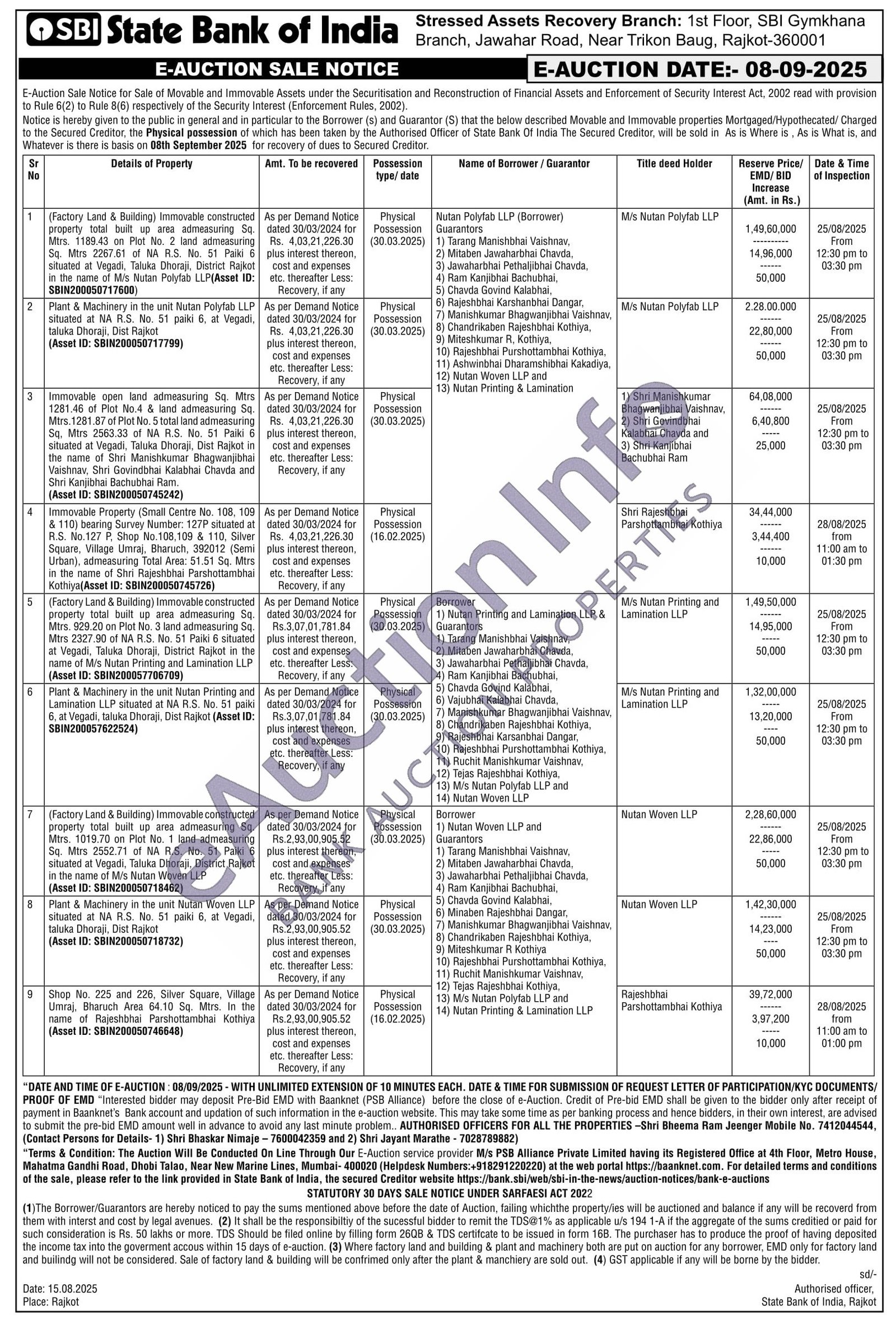 Plant & Machinery in the unit Nutan Polyfab LLP situated at NA R.S. No. 51 paiki 6, at Vegadi, taluka Dhoraji, Dist Rajkot (Asset ID: SBIN200050717799)