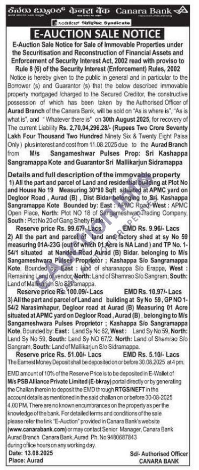 All the part and parcel of Land and building at Sy No 59, GP NO 1-54/2 Narasimhapur, Degloor road at Aurad (B) Measuring 01 Acre situated at APMC yard on Degloor Road, Aurad (B), belonging to M/s Sangameshwara Pulses Proprietor: Kashappa S/o Sangramappa Kote, Bounded by: East: Land Sy No 62, West: Land Sy No 59, North: Land Sy No 59, South: Land Sy NO 67/2. North: Land of Shamrao S/o Sangram, South: Land of Mallikarjun Sio Sidramappa