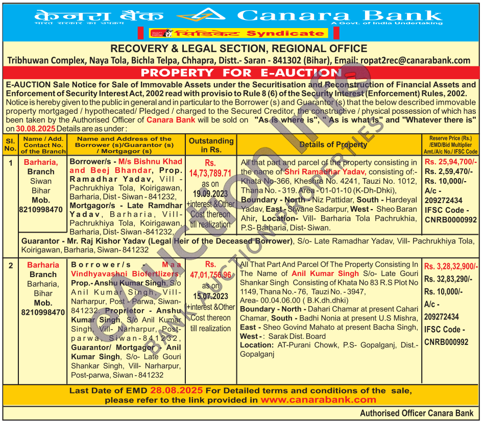 All that part and parcel of the property consisting in the name of Shri Ramadhar Yadav, consisting of:-Khata No-366, Kheshra No. 4241, Tauzi No. 1012, Thana No.-319. Area-01-01-10 (K-Dh-Dhki),Boundary - North - Niz Pattidar, South - Hardeyal Yadav, East - Siwane Sadarpur, West - Sheo Baran Ahir, Location- Vill- Barharia Tola Pachrukhia, P.S-Barharia, Dist-Siwan.