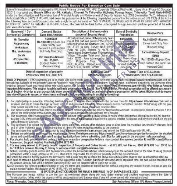 All that part and parcel of the property bear-ing All that part and parcel of the property bearning Plot No. 50, Northern Side, Survey No. 5152 in New Survey No.515416 Patta No. 3511, Situated At No. 76, S Veeraragava Swamy Nagar, Thaneerklam Village. Thiruvallur Taluk And District. Tr. India, India 602021 Area Admeasuring (In St. FL) Property Type: Land Area Built Up Area Carpet Area Property Area 876.00, 623.00.529.00