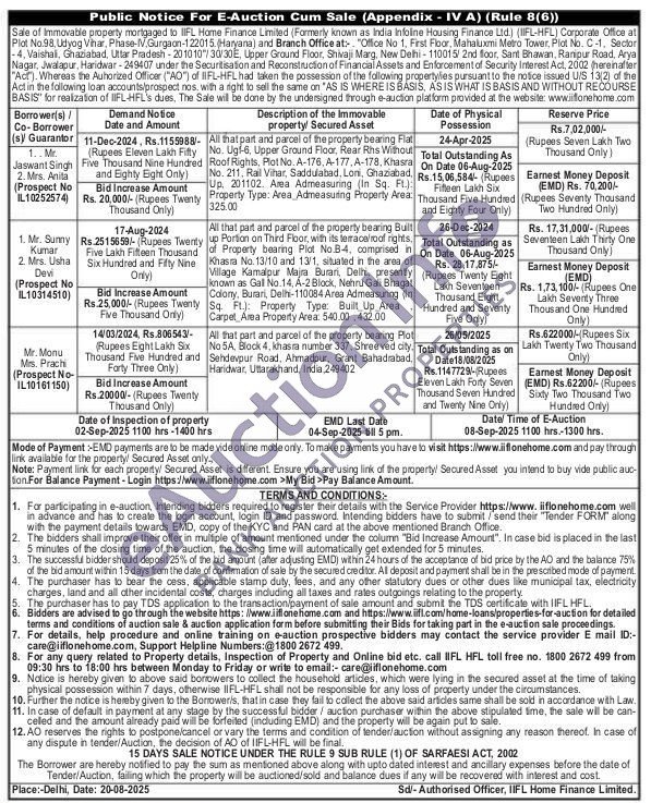 All that part and parcel of the property bearing Bult up Portion on Third Floor, with its terrace/roof rights. of Property bearing Plot No.B-4, comprised in Khasra No. 13/10 and 13/1, situated in the area of Village Kamalpur Majra Burari, Delhi, presently known as Gall No. 14, A-2 Block, Nehru Gali Bhagat Colony, Burari, Delhi-110084 Area Admeasuring In Sq. Ft.): Property Type: Built Up Area Carpet Area Property Area: 540.00 432.00