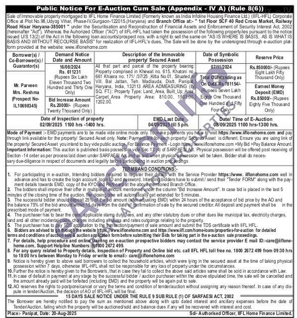 All that part and parcel of the property bearing: Property comprised in Khewat no. 615. Khatoni no. 661 Khasra no. 171//37/25 Kitta No.01, Situated in Vill. Bal Jattan, Teh. Madlauda, Distt. Panipat, Haryana, India, 132113 AREA ADMEASURING (IN SQ. FT.): Property Type: Land Area, Built Up Area, Carpet Area Property Area: 810.00, 1503.00, 1202.00.