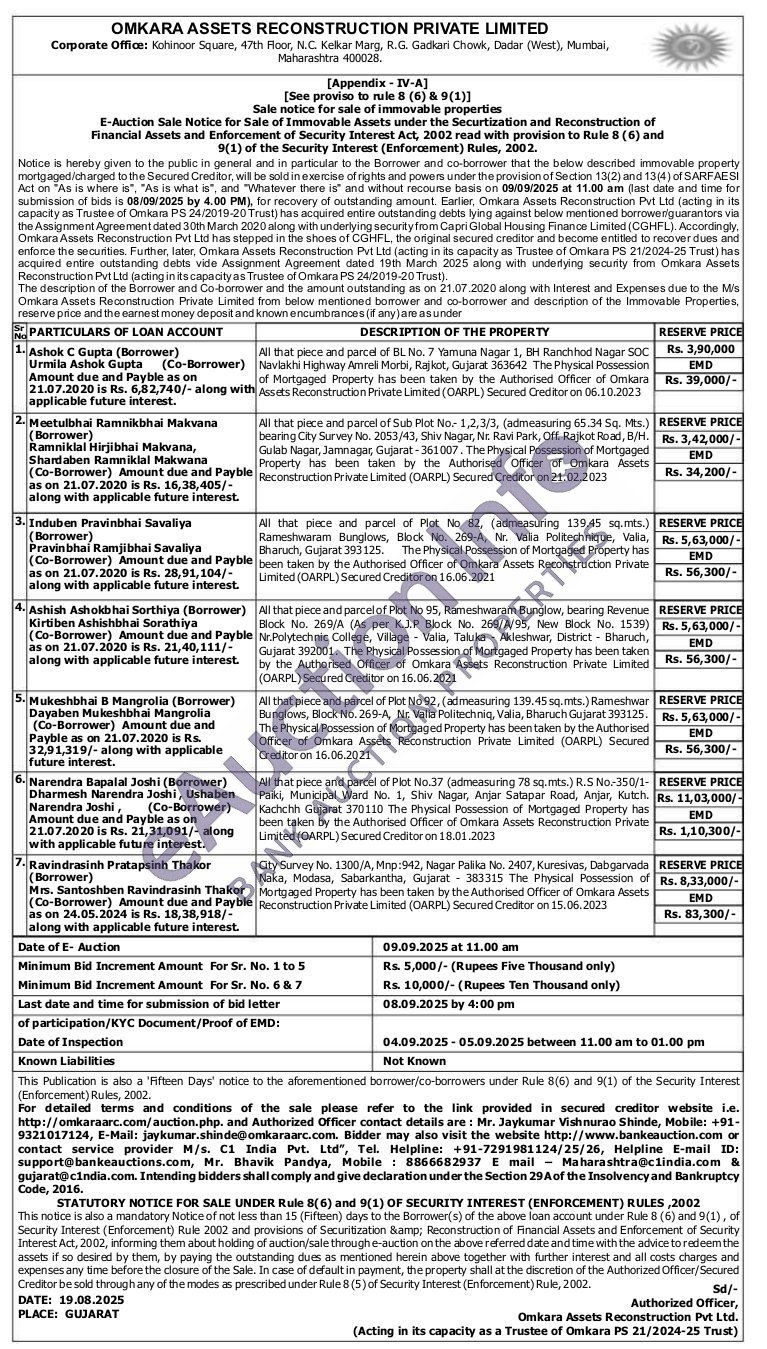 All that piece and parcel of Plot No 95, Rameshwaram Bunglow, bearing Revenue Block No. 269/A (As per K.J.P Block No. 269/A/95, New Block No. 1539) Nr.Polytechnic College, Village Valia, Taluka Akleshwar, District - Bharuch, Gujarat 392001. The Physical Possession of Mortgaged Property has been taken by the Authorised Officer of Omkara Assets Reconstruction Private Limited (OARPL) Secured Creditor on 16.06.2021