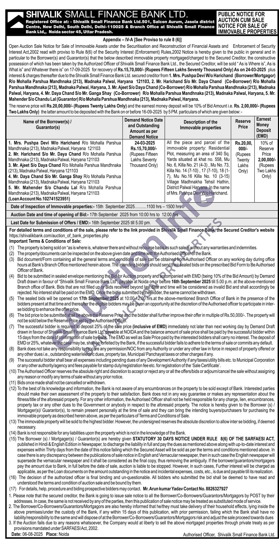 All the piece and parcel of the immovable property: Residential Plot, measuring an area of 340 Sq. Yards situated at khat no. 558, Mu No. 6, Killa No. 21 (4-3), Mu No. 73, Killa No. 14 (7-10), 17 (7-10), 18 (1-7), Mu No.16 Killa No. 10 (3-15) Village Madhnakha Tehsil Hathin, District Palwal Haryana. In the name of Mrs. Pushpa Devi W/o Harichand.