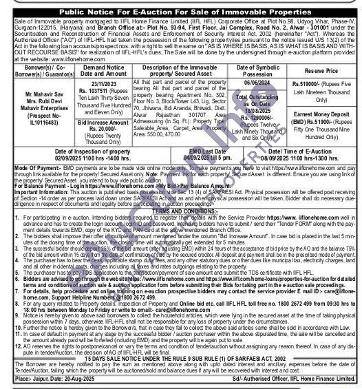 All that part and parcel of the property bearing All that part and parcel of the property bearing Apartment No. 302 Floor No. 3. Block Tower 143, Lig. Sector 70, Jhiwana, Bd Ananda, Bhwadi. Distt. Alwar Rajasthan 301707 Area Admeasuring (in Sq. Ft): Property Type: Saleable Area Carpet Area Property Area: 550.00, 470.00