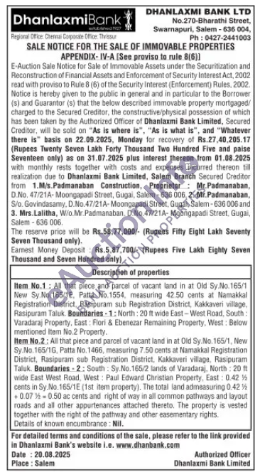 Item No.1: All that piece and parcel of vacant land in at Old Sy.No.165/1 New Sy. No.165/1E, Patta No.1554, measuring 42.50 cents at Namakkal Registration District, Rasipuram sub Registration District, Kakkaveri village. Rasipuram Taluk. Boundaries 1: North: 20 ft wide East-West Road, South: Varadaraj Property, East: Flori & Ebenezar Remaining Property, West: Below mentioned Item No.2 Property, Item No.2: All that piece and parcel of vacant land in at Old Sy.No. 165/1, New Sy.No.165/1G, Patta No. 1466, measuring 7.50 cents at Namakkal Registration District, Rasipuram sub Registration District, Kakkaveri village, Rasipuram Taluk. Boundaries 2: South: Sy No. 165/2 lands of Varadaraj, North: 20 ft wide East West Road, West: Paul Edward Christian Property, East: 0.4216 cents in Sy. No.165/1E (1st item property). The total land admeasuring 0.42% +0.07 0.50 ac cents and right of way in all common pathways and layout roads and all other appurtenances attached thereto. The property is vested together with the right of the pathway and other easementary rights. Details of known encumbrance: Nil.