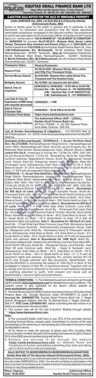 Ramanathapuram Regd District, Ramanathapuram Joint ISRO. Ramanathapuram Taluk, Door No as per Property Tax. 38. Kothanar West Street, Ramanathapuram Town, Ward-B, Block-4, total extent 910 Sq.ft comprised in Survey No: TS.No-24, GRS. 325/394, As per Revenue Record: TS.No-24, Bounded by: North By- East West common pathway, Nagalakshmi House, South By- Elangovan Vacant Land, House, East By- Elangovan Vacant Land, Vennilam, West By-Arumugam Land, Admeasuring: East West on North 51.25 ft. East-West on South-51.25 ft. South North on West-17.45 ft. South-North on East-17.45 ft with all easement rights and pathway. SCHEDULE-II: As per Sale Deed Doc. No. 642/2022. Ramanathapuram Regd District, Ramanathapuram Joint I SRO, Ramanathapuram Taluk Kothanar West Street. Ramanathapuram Town, Ward-B, Block-4, Total Extent: 855-855180931.5-2821.50 Sq Ft. comprised in Survey No: T.S.No-25, 28.29, 30, 31, GRS. 325/394, GRS. 325/397, GRS. 325/398 As per Revenue Record: T.S. No-25, 28.29, 30, 31, Item 1: Boundaries for 855 Sq.ft of Land. North By- Gopal, Sampath House, South By-Thiraviyam Part Land. East By-4 Feet Wide South North Common Lane Path, West By-2nd Item. Admeasuring: East West on North-45 ft. East-West on South-45ft, South North on West-19 ft. South-North on East-19 ft with all easement rights and pathway. Item 2: Boundaries for 855 Sq.ft of Land. North By 3 Feet Wide East West Common Lane Path Easwaramoorthy & Gopal House. South By Thiraviyam Part Land, East By-4ft wide South North Common Path & 1st Item, West By-South North Road. Admeasuring. East West on North-45 ft. East-West on South-45 ft. South North on West 19 ft. South-North on East -19 ft with all easement rights and pathway. Item 3: Boundries for 180 Sq.ft of Land: North By-3 Feet Wide East West Common Lane Path, Muniasamy devar and Other House, South By Krishnamoorthy, Sivagnanam House, East By- Elangovan Land, West By Muniasamy devar & Thiraviyam Vacant Land. Admeasuring: East West on North-9 ft. East-West on South-9 ft South North on West-20 ft. South-North on East -20 ft with all easement rights and pathway Item 4: Boundaries for 1400 Sq.ft. North By-Saravana sakkaravathi, Nallamuthu and Others Common East West 46Ft, South North 19ft Land, South By Elangovan House, Land East By-East West öft wide Common path, West By Gopal & Sampath Land. Admeasuring: East West on North-40 ft, East-West on South-44 ft. South North on West-30% ft. South-North on East-31 %ft with all easement rights and pathway (Originally the vendors derived 931.50 Sq. Ft only through parental and title documents. Nevertheless, the doc. No.642/2022 is conveying the extend of 1400 Sq Ft in favor of the mortgager in respect of Item No. 4 mentioned above). Together with all buildings and structure attached to the earth or permanently fastened to anything attached to earth, both present and future and all easementary/mamool rights annexed thereto