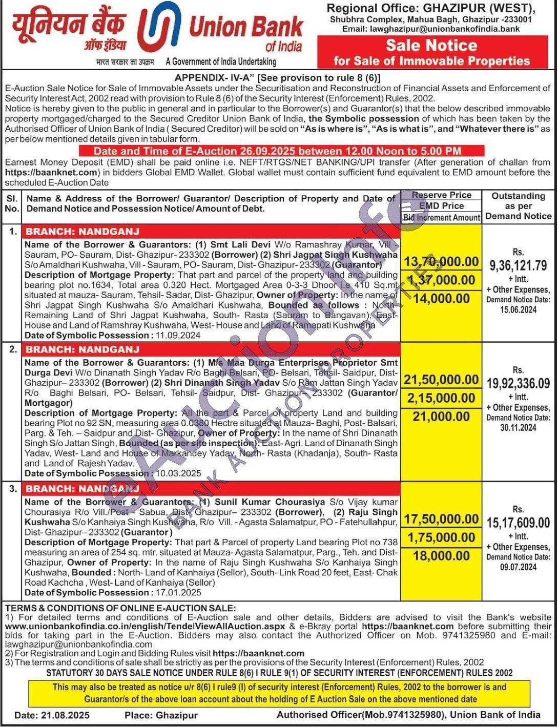 Description of Mortgage Property: All the part & Parcel of property Land and building bearing Plot no 92 SN, measuring area 0.0380 Hectre situated at Mauza-Baghi, Post-Balsari, Parg. & Teh.Saidpur and Dist-Ghazipur, Owner of Property: In the name of Shri Dinanath Singh S/o Jattan Singh, Bounded (as per site inspection): East-Agri. Land of Dinanath Singh Yadav, West- Land and House of Markandey Yadav, North- Rasta (Khadanja), South- Rasta and Land of Rajesh Yadav.