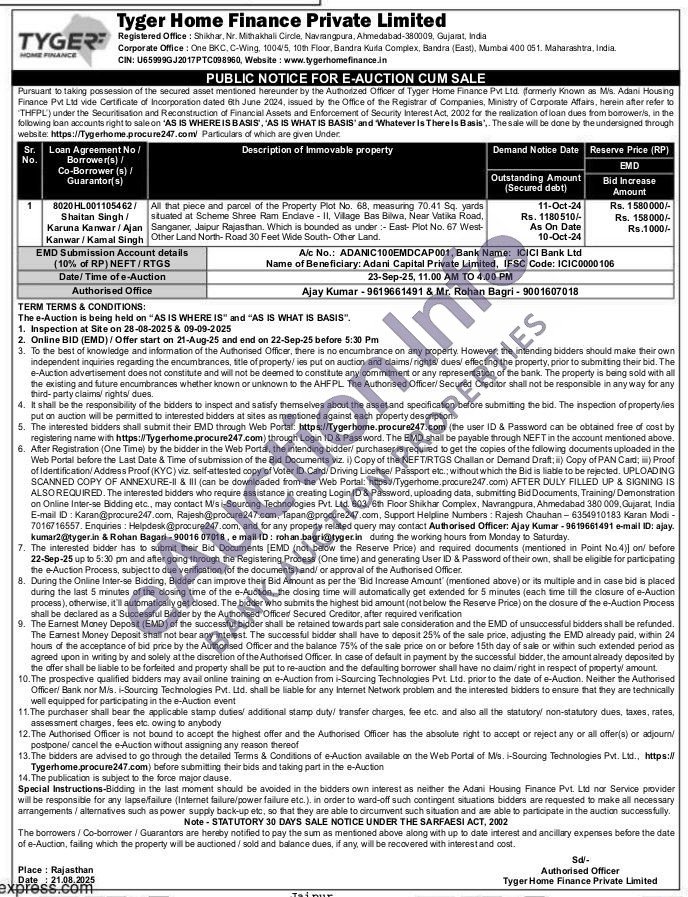 All that piece and parcel of the Property Plot No. 68, measuring 70.41 Sq. yards. situated at Scheme Shree Ram Endave - II, Village Bas Bilwa, Near Vatika Road, Sanganer, Jaipur Rajasthan. Which is bounded as under: East- Plot No. 67 West Other Land North-Road 30 Feet Wide South-Other Land