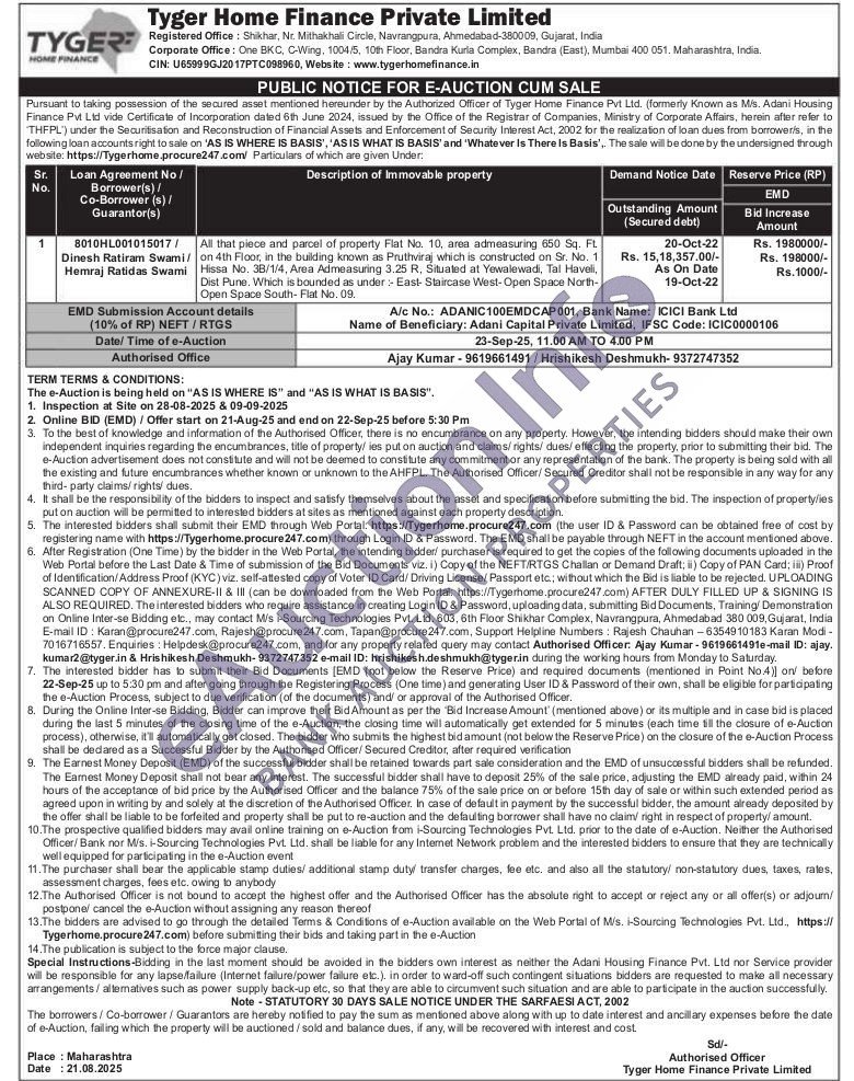 All that piece and parcel of property Flat No. 10, area admeasuring 650 Sq. Ft. on 4th Floor, in the building known as Pruthviraj which is constructed on Sr. No. 1 Hissa No. 3B/1/4, Area Admeasuring 3.25 R, Situated at Yewalewadi, Tal Haveli, Dist Pune, Which is bounded as under: East-Staircase West-Open Space North-Open Space South-Flat No. 09