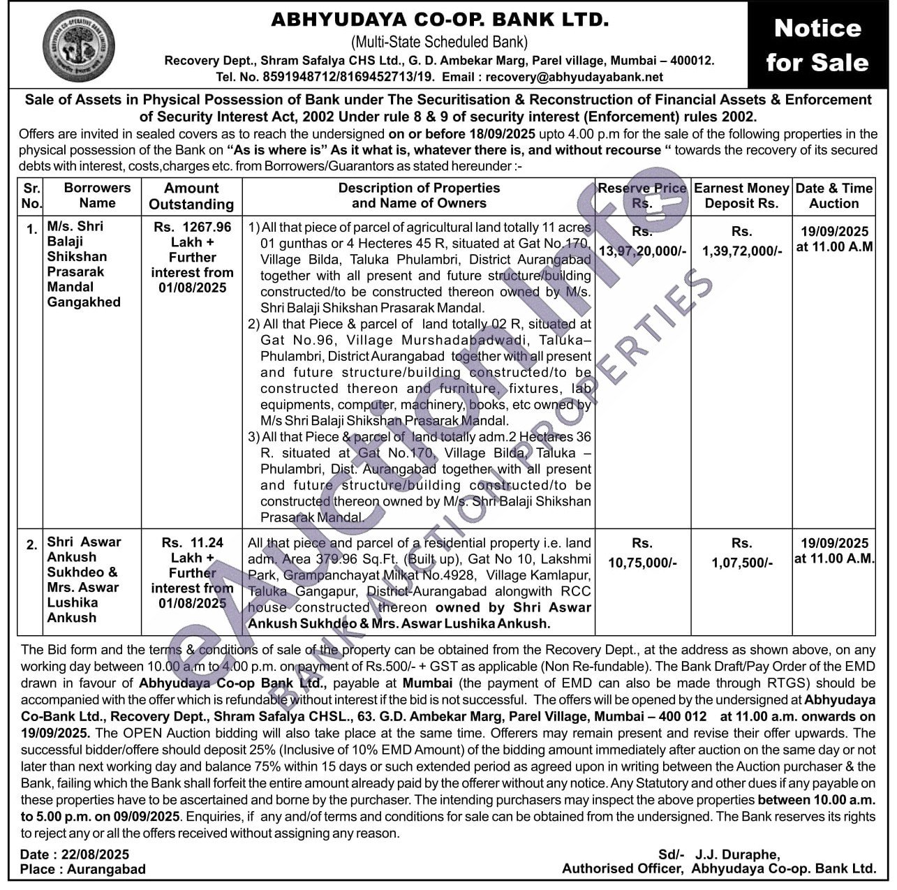 1) All that piece of parcel of agricultural land totally 11 acres 01 gunthas or 4 Hecteres 45 R, situated at Gat No. 170, Village Bilda, Taluka Phulambri, District Aurangabad together with all present and future structure/building constructed/to be constructed thereon owned by M/s. Shri Balaji Shikshan Prasarak Mandal.