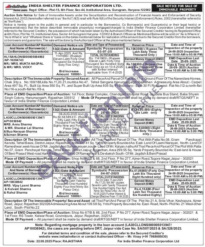 Description Of The Immovable Property/Secured Asset: All Piece And Parcel Of Flat No.117-a, Ground Floor Of The Narendera Homes, Chak 3rtp.s. No. 188/188, killa No.11,20,21,murbba No.47, Tehsil Sangaria Hanumangargh Rajasthan Admeasurig Area About:- Carpet Area 497 Sq. Ft., Built Up Area 550 Sq. Ft., and Super Built Up Area 605 Sq. Ft Boundary:- East-30 Ft Road,west- Flat No.112-a, north-flat No.116-a,south-flat No.118-a,