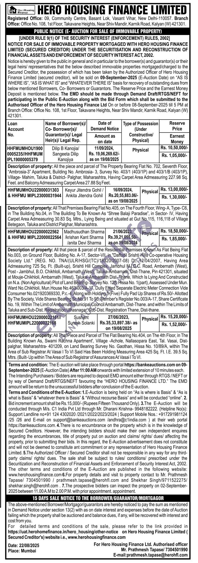 Description of property: All the piece and parcel of The Property Bearing Flat No. 702, Seventh Floor, "Ambrosia-3" Apartment, Building No. Ambrosia- 3, Survey No. 403/1 (403/1P) and 403/1/B (403/1P), Village- Mahim, Taluka & District- Palghar, Maharashtra, Having Carpet Area Admeasuring 227.98 Sq. Feet. and Balcony Admeasuring Carpet Area 27.88 Sq Feet.