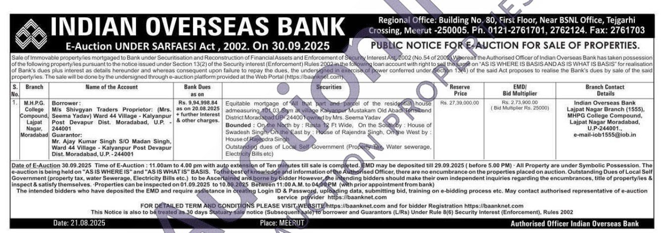 Equitable morigage of All that part and parcel of the residential house admeasuring 101.03 Sqm at village Kalyanpur Mustakam Old Abadi Tehsil and District Moradabad UP-244001