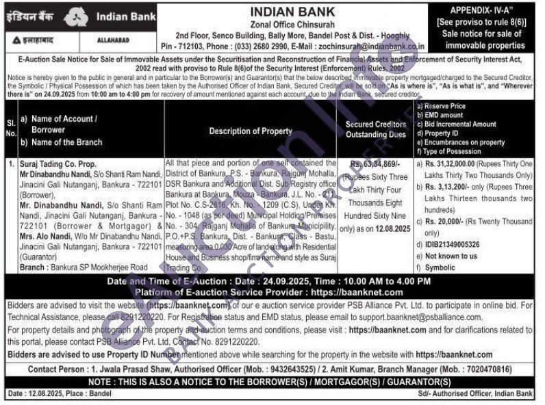 All that piece and portion of one self contained the District of Bankura, P.S. - Bankura, Rajgunj Mohalla. DSR Bankura and Additional Dist. Sub Registry office Bankura at Bankura, Mouza-Bankura, J.L. No.-211, Plot No. C.S-2816, Kh. No. 1209 (C.S), Under Kh. No. 1048 (as per deed) Municipal Holding/Premises No.304, Rajganj Mohalla of Bankura Municipility. P.O.+P.S. Bankura, Dist. Bankura, Class Bastu, measuring area 0.030 Acre of land along with Residential House and Business shop/firm name and style as Suraj Trading Co.