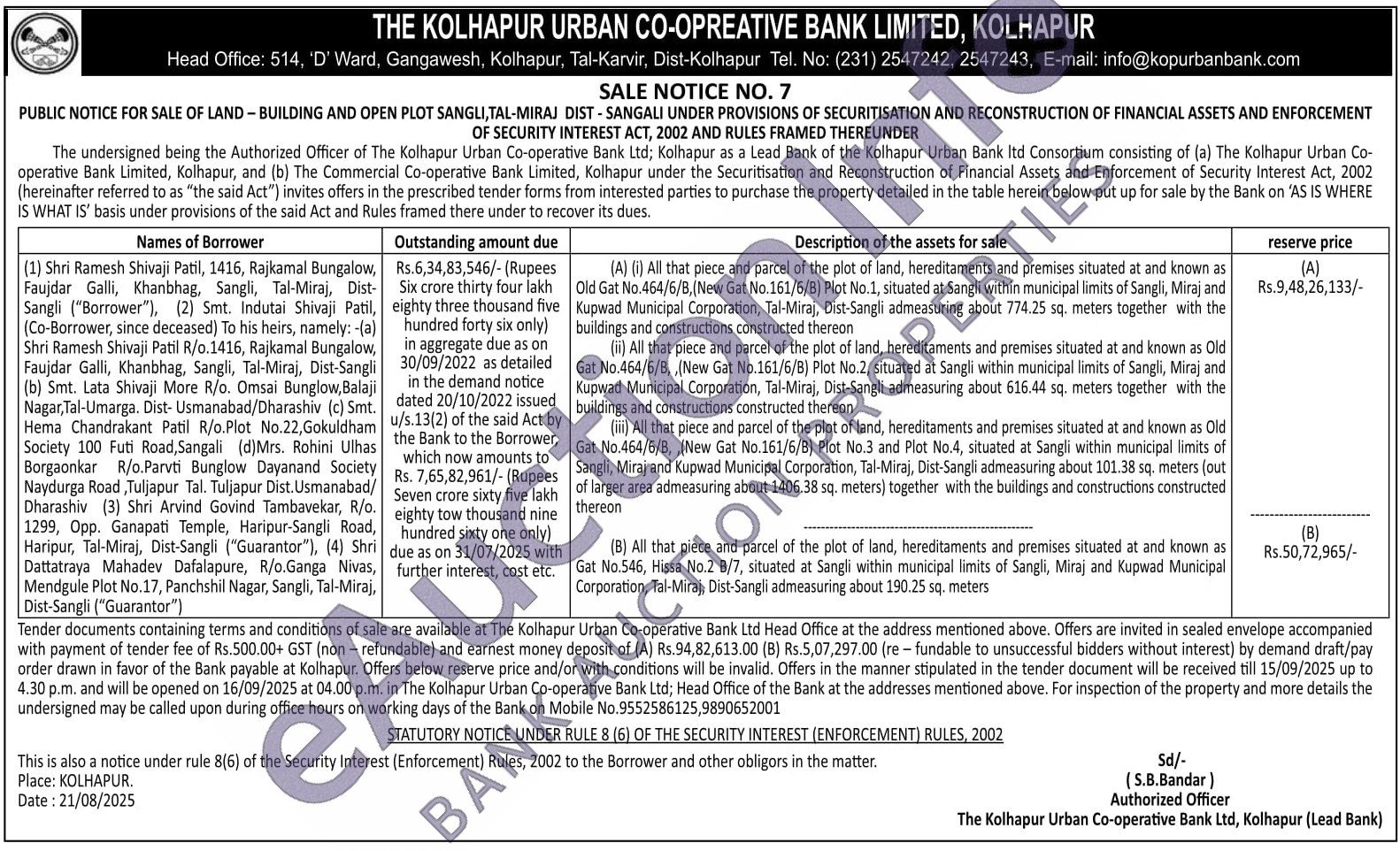 (ii) All that piece and parcel of the plot of land, hereditaments and premises situated at and known as Old Gat No.464/6/B,, (New Gat No.161/6/B) Plot No.2, situated at Sangli within municipal limits of Sangli, Miraj and Kupwad Municipal Corporation, Tal-Miraj, Dist-Sangli admeasuring about 616.44 sq. meters together with the buildings and constructions constructed thereon