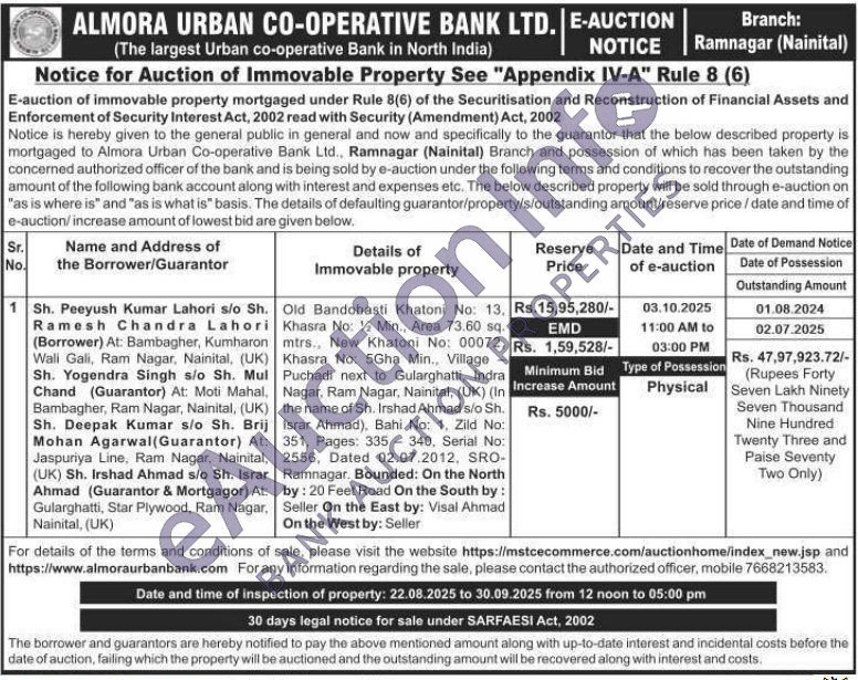 Old Bandobasti Khatoni No: 13. Khasra No: ½ Min., Area 73.60 sq. mtrs., New Khatoni No: 00072. Khasra No: 5Gha Min., Village Puchadi next to Gularghatti, Indra Nagar, Ram Nagar, Nainital, (UK) (In the name of Sh. Irshad Ahmad s/o Sh. Israr Ahmad), Bahi No: 1, Zild No: 351, Pages: 335 340, Serial No: 2556, Dated 02.07.2012, SRO-Ramnagar. Bounded: On the North by: 20 Feet Road On the South by: Seller On the East by: Visal Ahmad On the West by: Seller