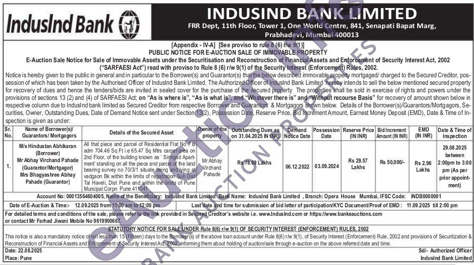 All that Piece & parcel of Residential Flat No 7 B adm 704.46 Sq Ft i.e 65.47 Sq Mtrs carpet area on 2nd Floor, of the building known as Sinhgad Apart-ment standing on all the piece and parcel of the land bearing survey no 70/3/1 situate being and lying at vadgaon Bk within the limits of registration Sub Dist Tal Haveli, Dist Pune and within the limits of Pune Muncipal Corpn Pune 411041