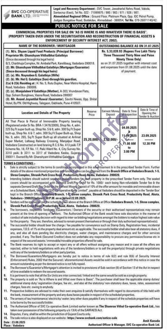 All That Piece & Parcel of Immovable Property bearing (Registered under Sr No. BRA-13478/2009), Shop No. 4, adm 225 Sq Ft super built-up. Shop No. 568, adm. 300 Sq. Ft Super built-up. Shop No. 6 & 7, adm, 300 Sq. Ft Super Built-up, Shop No. 5, adm. 265. Sq.Ft Super Built-up all situated at Arihinat Super Market, Lalbaug Railway Crossing, Manjalpur Road, Vadodara Constructed on lend braring 8.C.S No. 413 paiki T.P Scheme No. 18. FP. No. 17, Paiki Ward No. 4, City Survey No. 3310 paiki & 3311 to 3317 of Vadodara Kasba, Gujarat 390011. Owned By Mr. Ghanshyam Vitthalbhai Galathiya