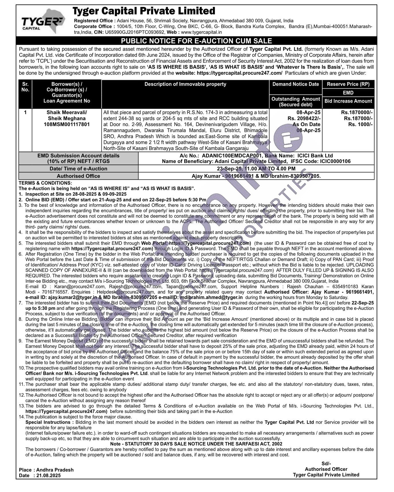 All that piece and parcel of property in R.S.No. 174-3 in admeasuring a total extent 244-38 sq yards or 204-5 sq mts of site and RCC building situated at Door no. 2-99, Assessment No. 164, Devinenivarigudem Village, H/o. Ramannagudem, Dwaraka Tirumala Mandal, Eluru District, Bhimadole SRO, Andhra Pradesh Which is bounded as: East-Some site of Kambala Durgayya and some 2 1/2 ft width pathway West-Site of Kasani Brahmayya North-Site of Kasani Brahmayya South-Site of Kambala Gangaraju
