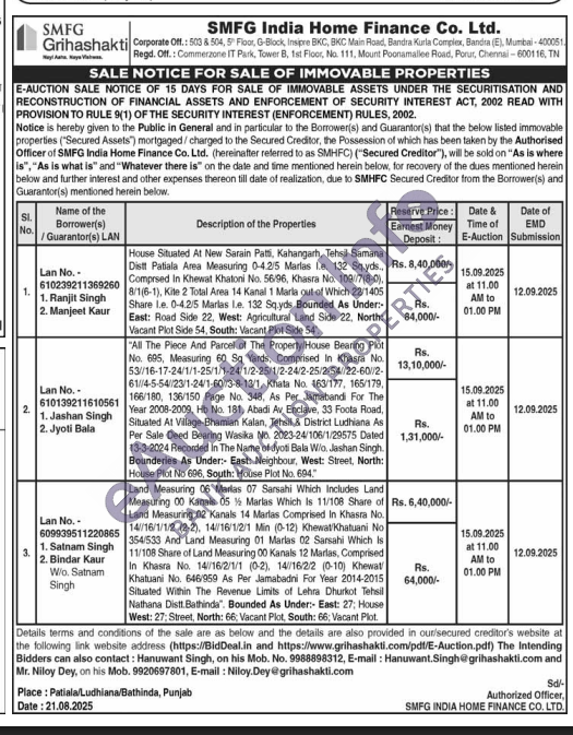 Land Measuring 06 Marlas 07 Sansahi Which Includes Land Measuring 00 Kanals 05 Marlas Which Is 11/108 Share of Land Measuring 02 Kanals 14 Marlas Comprised In Khasra No. 14/16/1/1/2 (2-2), 14/16/1/2/1 Min (0-12) Khewat Khatuani No 354/533 And Land Measuring 01 Marlas 02 Sansahi Which is 11/108 Share of Land Measuring 00 Kanals 12 Marlas, Comprised In Khasra No. 14/16/2/1/1 (0-2), 14/16/2/2 (0-10) Khewat Khatuani No. 646/959 As Per Jamabadni For Year 2014-2015 Situated Within The Revenue Limits of Lehra Dhurkot Tehsil Nathana Distt. Bathinda". Bounded As Under: East: 27; House West: 27: Street, North: 66; Vacant Plot, South: 66: Vacant Plot