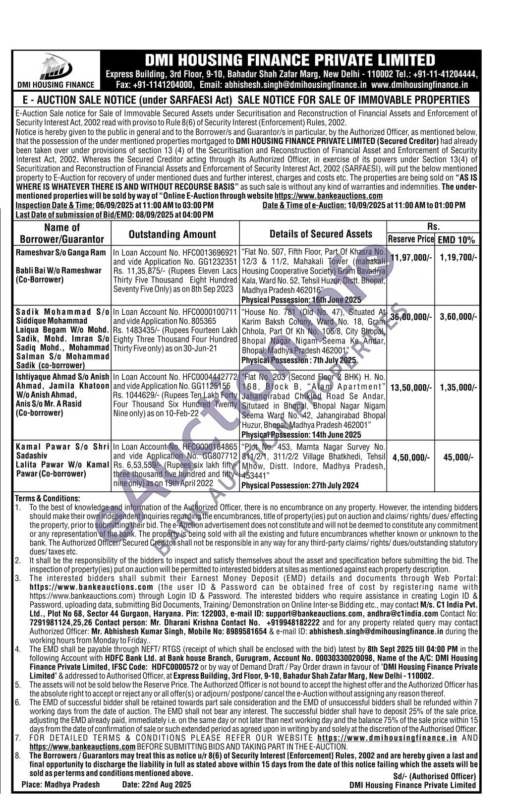 Flat No. 507, Fifth Floor, Part Of Khasra No. 12/3 & 11/2, Mahakali Tower (mahakali Housing Cooperative Society) Gram Bavadiya Kala, Ward No. 52, Tehsil Huzur, Distt. Bhopal, Madhya Pradesh 462016" Physical Possession: 16th June 2025