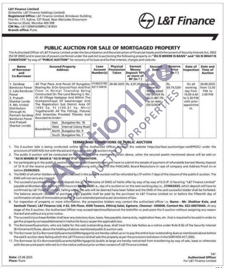All That Piece And Parcel Of Bungalow Bearing No. 8 On Ground Floor And First Floor in Nirmal Township Being Constructed On The Land Bearing 5. No. 41 At Village Hadapsar And Within The Grampanchayat Of Sasanenagar And The Registration Sub District Area Of 1083 Sq. Ft (100.61 Sq. Mtrs) Togetherwith All The Fittings, Fixtures And Amenities Provided Thereto And Bounded As Under: