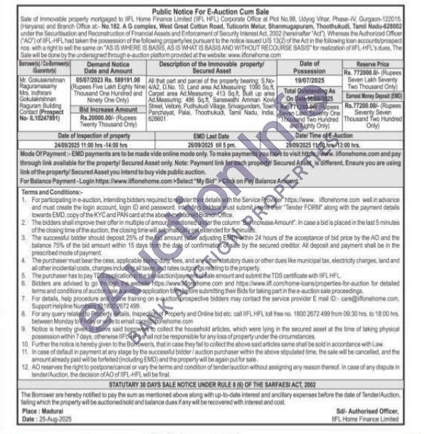 All that part and parcel of the property bearing: 5 No 4/42, D.No. 10, Land arma Ad Measuring 1000 50 Carpet area Ad Measung 413 Sqit Bull up ama Ad. Measuring 486 Sq. Saraswathi Amman Kovi Street, Veliore, Puthukudi Village, Srivargundam Town Panchayat, Palal, Thoothukud, Tamil Nadu, India, 620001
