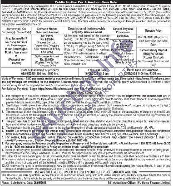 All that part and parcel of the property bearing: SF No 279, Ward B, Block No 28, admeasuring 450 Sq. Ft. (Land Area) $753 34 FL (Carpet Area) & 866 Sq. Ft. (Built Up Area). Kendaiyur Harijana Colony, Chikkadasampalayam Village, Mettupalayam, Coimbatore. Near Goverment School, Coimbatore, Tamil Nadu, India-641305.