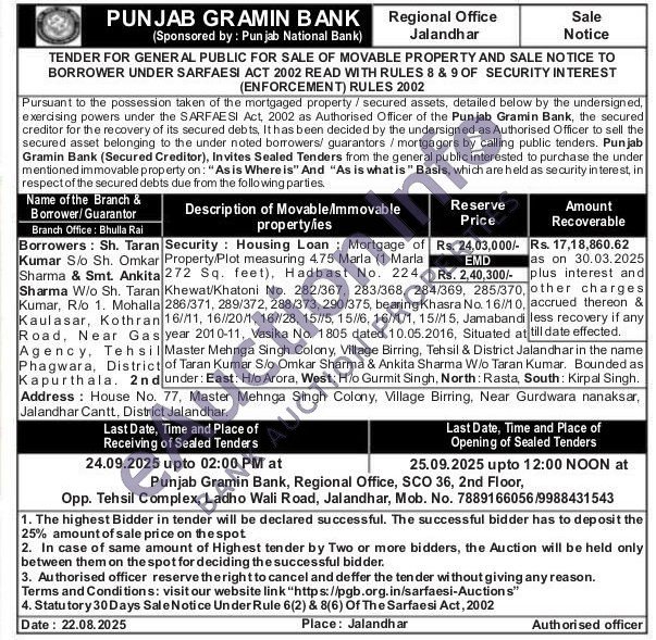 Security: Housing Loan: Mortgage of Property Plot measuring 4.75 Marla (1 Marla 272 Sq. feet), Hadbast No. 224 Khewat/Khatoni No. 282/367, 283/368, 284/369, 285/370 286/371, 289/372, 288/373, 290/375, bearing Khasra No. 16//10 16//11, 16//20/1, 16//28, 15/15, 15/16, 16//1/1, 15//15, Jamabandi year 2010-11, Vasika No. 1805 dated 10.05.2016, Situated at Master Mehnga Singh Colony, Village Birring, Tehsil & District Jalandhar in the name of Taran Kumar S/o Omkar Sharma & Ankita Sharma W/o Taran Kumar. Bounded as under: East: H/o Arora, West: H/o Gurmit Singh, North: Rasta, South: Kirpal Singh