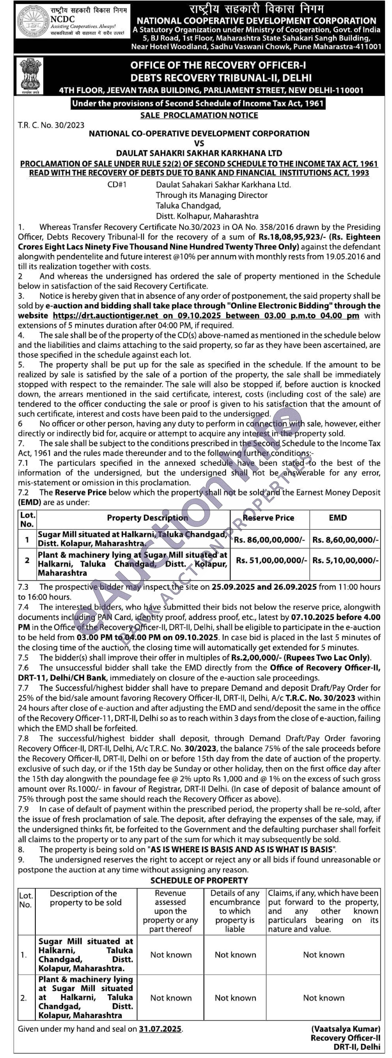 Plant & machinery lying at Sugar Mill situated at Halkarni, Taluka Chandgad, Distt. Kolapur, Maharashtra