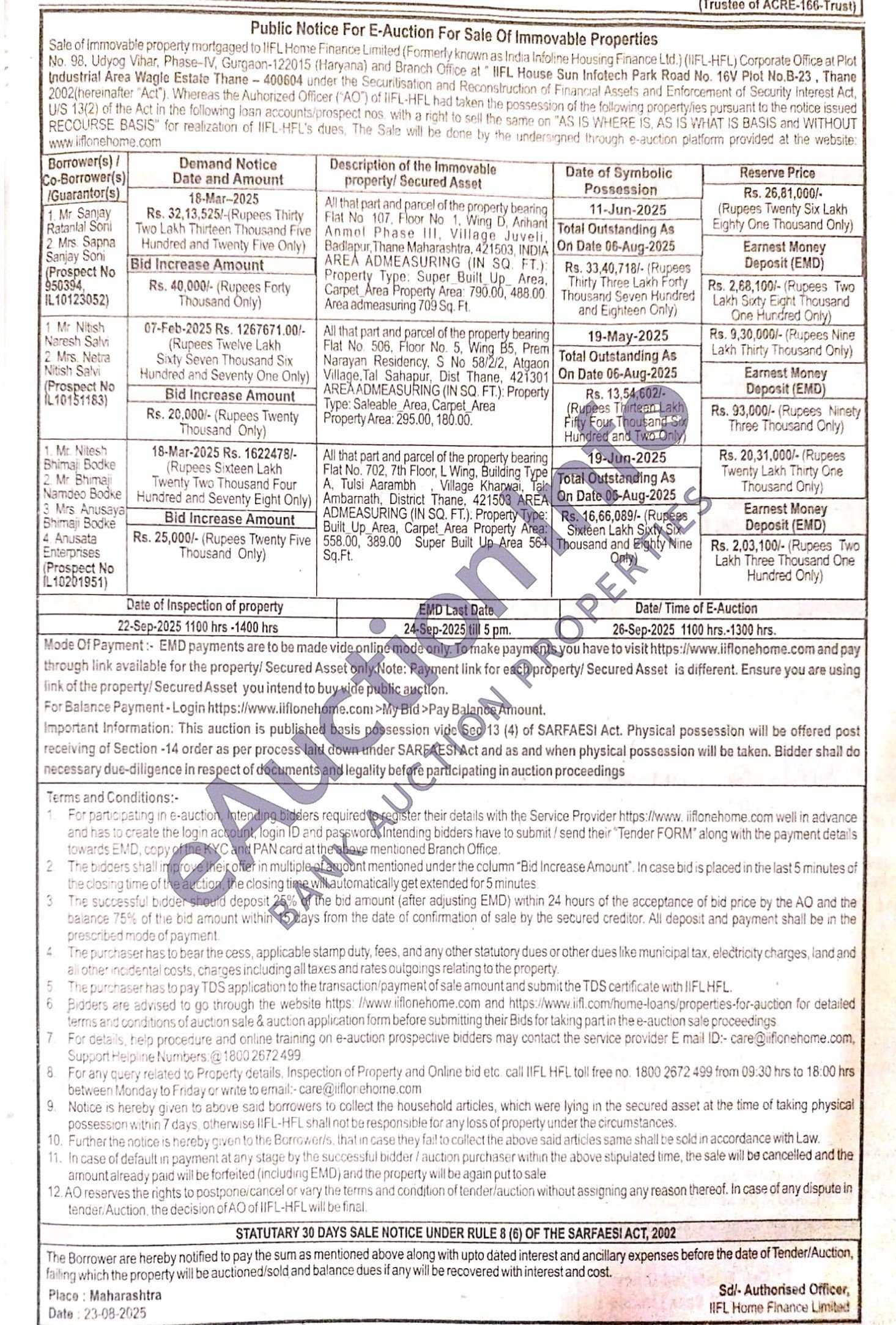 1) All that part and parcel of the property bearing Flat No 107, Floor No 1. Wing D, Arihant Anmol Phase III, Village Juveli, Badlapur, Thane Maharashtra, 421503, INDIA AREA ADMEASURING (IN SQ. FT.) Property Type: Super Built Up Area, Carpet Area Property Area: 790.00, 488.00 Area admeasuring 709 Sq. Ft