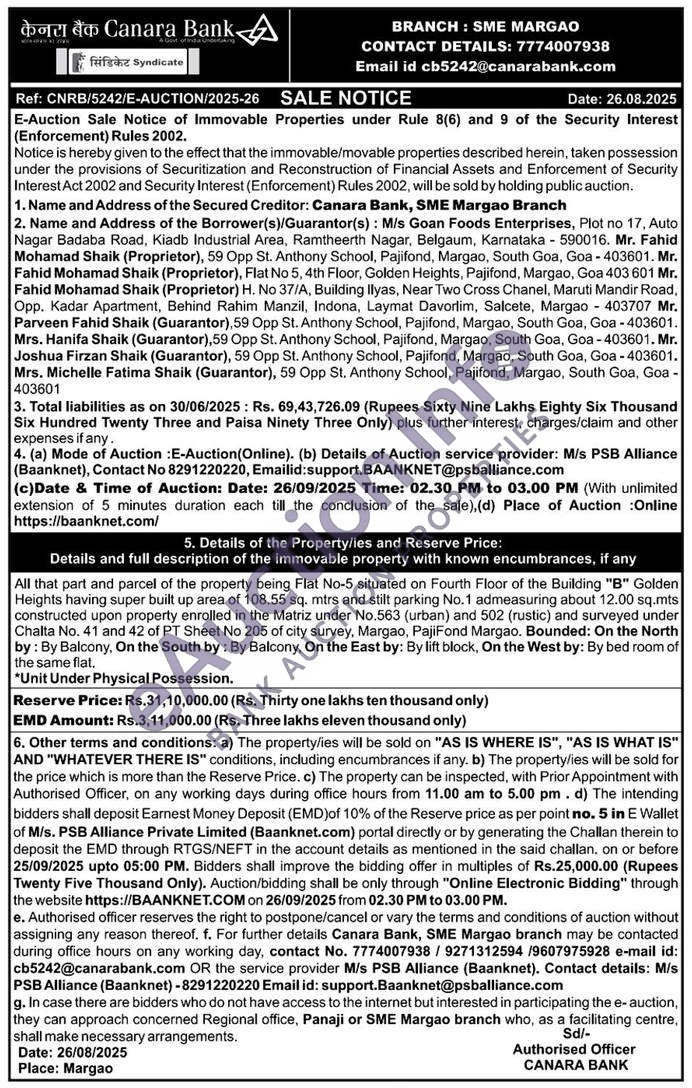 All that part and parcel of the property being Flat No-5 situated on Fourth Floor of the Building "B" Golden Heights having super built up area of 108.55 sq. mtrs and stilt parking No.1 admeasuring about 12.00 sq.mts constructed upon property enrolled in the Matriz under No.563 (urban) and 502 (rustic) and surveyed under Chalta No. 41 and 42 of PT Sheet No 205 of city survey, Margao, PajiFond Margao. Bounded: On the North by: By Balcony, On the South by: By Balcony, On the East by: By lift block, On the West by: By bed room of the same flat.