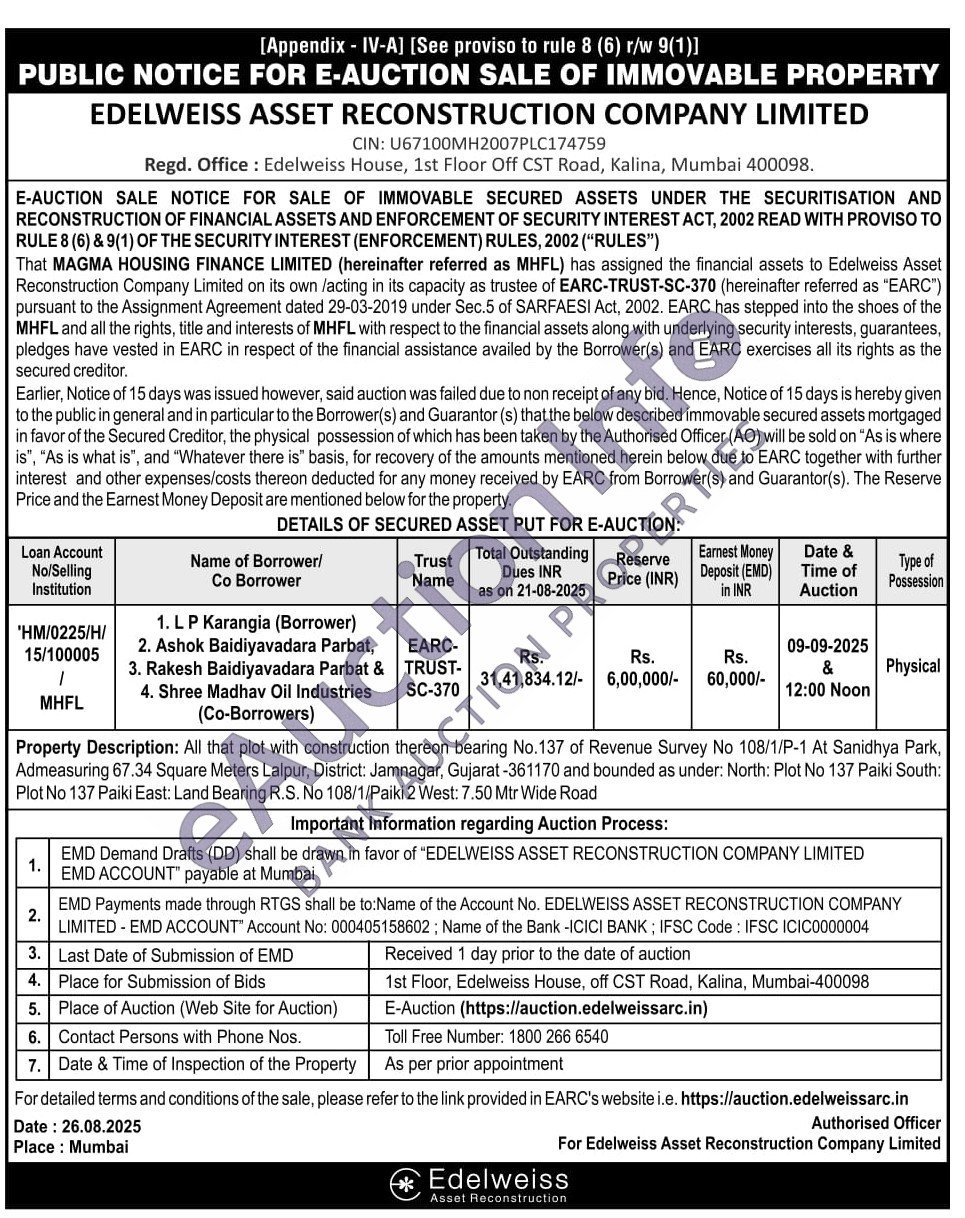 Property Description: All that plot with construction thereon bearing No.137 of Revenue Survey No 108/1/P-1 At Sanidhya Park, Admeasuring 67.34 Square Meters Lalpur, District: Jamnagar, Gujarat-361170 and bounded as under: North: Plot No 137 Paiki South: Plot No 137 Paiki East: Land Bearing R.S. No 108/1/Paiki 2 West: 7.50 Mtr Wide Road
