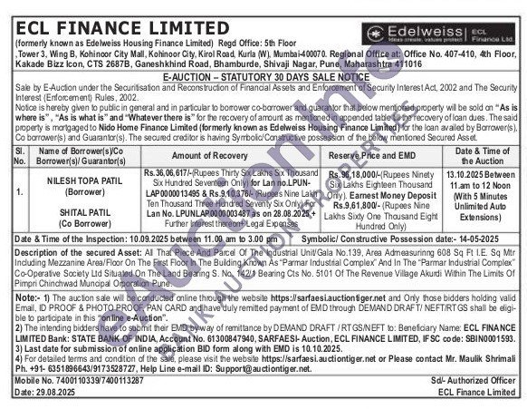 Description of the secured Asset: All That Piece And Parce Of The Industrial Unit Gala No.139, Area Admeasurinng 608 Sq Ft. LE. Sq Mtr Including Mezzanine Area/Floor On The First Floor In The Building Known As "Parmar Industrial Complex And In The "Parmar Industrial Complex" Co-Operative Society Ltd Situated On The Land Bearing S. No. 142/1 Bearing Cts No. 5101 Of The Revenue Village Akurdi Within The Limits Of Pimpri Chinchwad Muncipal Orporation Pune.