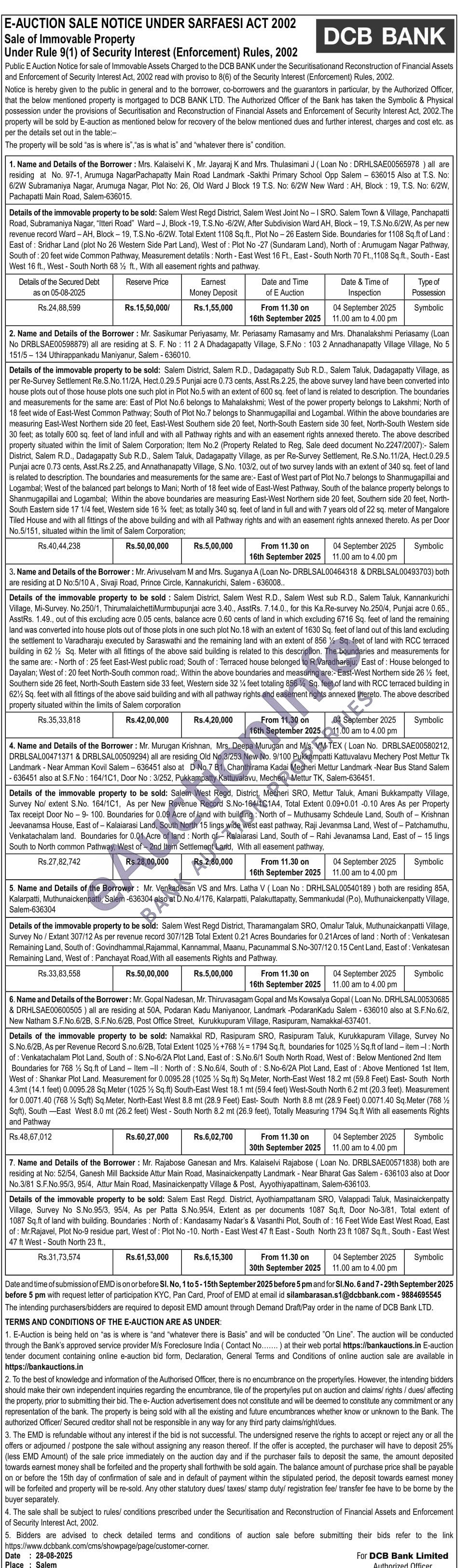 Details of the immovable property to be sold: Namakkal RD, Rasipuram SRO, Rasipuram Taluk, Kurukkapuram Village, Survey No S.No.6/2B, As per Revenue Record S.no.6/2B, Total Extent 1025½+768 1794 Sq.ft, boundaries for 1025% Sq.ft of land-item-1: North of: Venkatachalam Plot Land, South of: S.No-6/2A Plot Land, East of: S.No.6/1 South North Road, West of: Below Mentioned 2nd Item Boundaries for 768½ Sq.ft of Land Item-II: North of: S.No.6/4, South of: S.No-6/2A Plot Land, East of: Above Mentioned 1st Item, West of: Shankar Plot Land. Measurement for 0.0095.28 (1025 Sq.ft) Sq.Meter, North-East West 18.2 mt (59.8 Feet) East-South North 4.3mt (14.1 feet) 0.0095.28 Sq.Meter (1025% Sq.ft) South-East West 18.1 mt (59.4 feet) West-South North 6.2 mt (20.3 feet). Measurement for 0.0071.40 (768½ Sqft) Sq.Meter, North-East West 8.8 mt (28.9 Feet) East- South North 8.8 mt (28.9 Feet) 0.0071.40 Sq.Meter (768½ Sqft), South-East West 8.0 mt (26.2 feet) West - South North 8.2 mt (26.9 feet), Totally Measuring 1794 Sq.ft With all easements Rights and Pathway