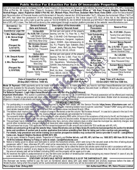 All that part and parcel of the property bearing Rat No C-560, Floor No. 5, Rimisha Residency, Khasra No 241. Vil Nayakhera, Tehsilladpura, Kota 324008. Area Admeasuring (In Sq. Pt.): Property Type: Saleable, Area Built Up Ares, Carpet Area Property Area: 466.00, 330.00, 300.00 (Area admeasuring 122.85 Sq. Ft.)