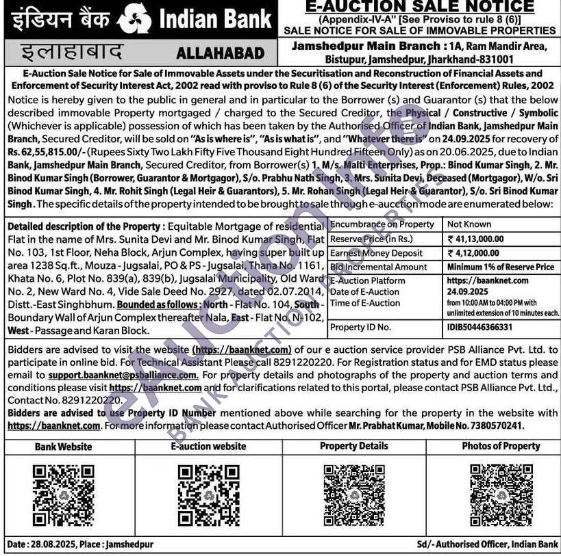 Equitable Mortgage of residential Flat in the name of Mrs. Sunita Devi and Mr. Binod Kumar Singh, Flat No. 103, 1st Floor, Neha Block, Arjun Complex, having super built up area 1238 Sq.ft., Mouza - Jugsalai, PO & PS - Jugsalai, Thana No. 1161, Khata No. 6, Plot No. 839(a), 839(b), Jugsalai Municipality, Old Ward No. 2, New Ward No. 4, Vide Sale Deed No. 2927, dated 02.07.2014, Distt.-East Singhbhum
