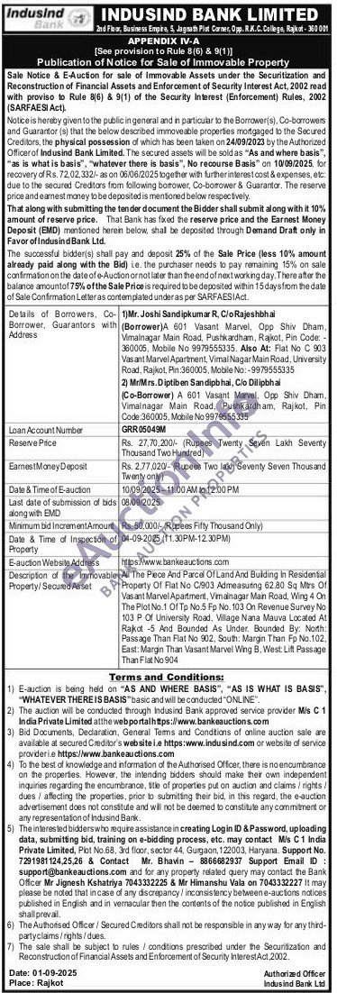 All The Piece And Parcel Of Land And Building In Residential Property Of Flat No C/903 Admeasuring 62.80 Sq Mitrs Of Vasant Marvel Apartment, Vimalnagar Main Road, Wing 4 On The Plot No.1 Of Tp No.5 Fp No. 103 On Revenue Survey No 103 P Of University Road, Village Nana Mauva Located At Rajkot -5 And Bounded As Under. Bounded By: North: Passage Than Flat No 902, South: Margin Than Fp No.102. East: Margin Than Vasant Marvel Wing B. West: Lift Passage Than Flat No 904