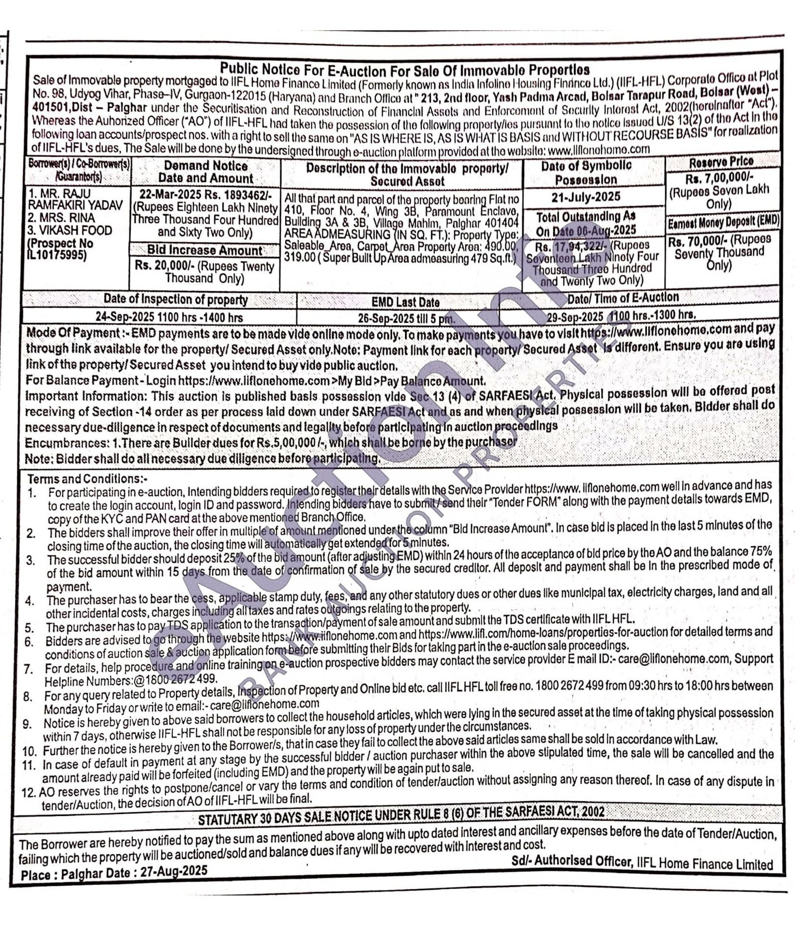 All that part and parcel of the property bearing Flat no 410, Floor No. 4, Wing 3B, Paramount Enclave, Building 3A & 3B, Village Mahim, Palghar 401404 AREA ADMEASURING (IN SQ. FT.): Property Type: 319.00 (Super Built Up Area admeasuring 479 Sq.ft.)