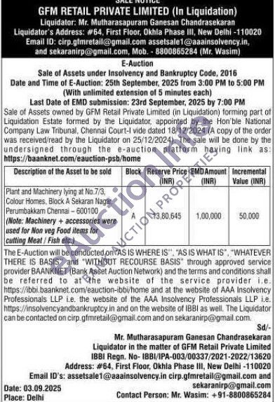 Plant and Machinery lying at No.7/3, Colour Homes, Block A Sekaran Nagar, Perumbakkam Chennai-600100
