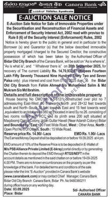 Details and full description of the immovable property : House bearing No CMC No 9-5-612/1 constructed over plot no 7 admeasuring East-West 60 ft towards North and 28+32 feet towards south and North-South 30 feet towards East and 15 feet towards west equivalent to an total area 1380 sq ft located in land Sy no 26. consisting of two rooms roofed with RCC and its plinth area 200 sqft situated at Maqdoomji Darga Colony, Udan Gullar Haveli (Near Adarsh Colony) Bidar and Bounded by: East: 20 Feet Wide Road, West: Other Area, North: Open Plot No 6 Of Others, South: 15 Wide Road