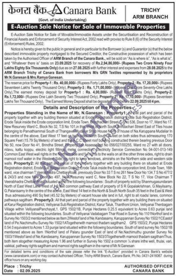 Properties Standing in the Name of Mr, N.Ganesan: Property3: All that part and parcel of the property together with any building there on situated at Karur Registration district, Velliyanai Sub Registration District, Karur Taluk, Thanthoni Union, Velliyanai Thenbagam Village within Velliyanai Panchayat, 1. GPS 1502/18, Punjai Hectares 0.25.5 equivalent to Acres 0.63 punjai land situated within the following boundaries. South of Velliyanai Vadabagam Thar Road in Survey No 1101 Northof land in Survey No 1503/2 mentioned below as Item 2Westof land of Ne Kandasamy, Karuppannan Survey No 1502/1CEastof land of Pe.Nachimuthu Survey No 1502/1ATogetherwith mamool thadam sagitham2. GPS 1503/2, Punjai Hectares 0.54.0 equivalent to Acres 1.33 punjai land situated within the following boundaries. South of land survey No 1502/18 mentioned above as Item 1Northof land of Palaru gounder East of land of Ne Nachimuthu gounder Survey No 1503/1Westof land of Ne. Kandasamy, Karuppannan Survey No 1503/3 Togetherwith mamool thadam sagitham Thus, both item stogether measuring Acres 1.96 and further in Survey No 1502 a common ¼ share inthe well, thulai, vari, vaikkal, pathway rights sagitham and mamool rights sagitham in the name of Mr.N Ganesan
