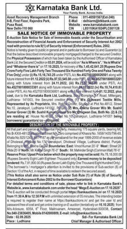 All that part and parcel of Residential Property, measuring 175 square yards, bearing MC No. B-XXIII-481/2, situated at Street No. Zero comprised of Khasra No. 1658/1435/796-65 Khata No.925/1243, 897/1187 as per jamabandi for the year 1999-2000 of revenue estate of Dholewal, Hadbast No. 174, Janakpuri, Dholewal Village, Ludhiana district, Punjab Belonging to Mrs. Rekha Grover