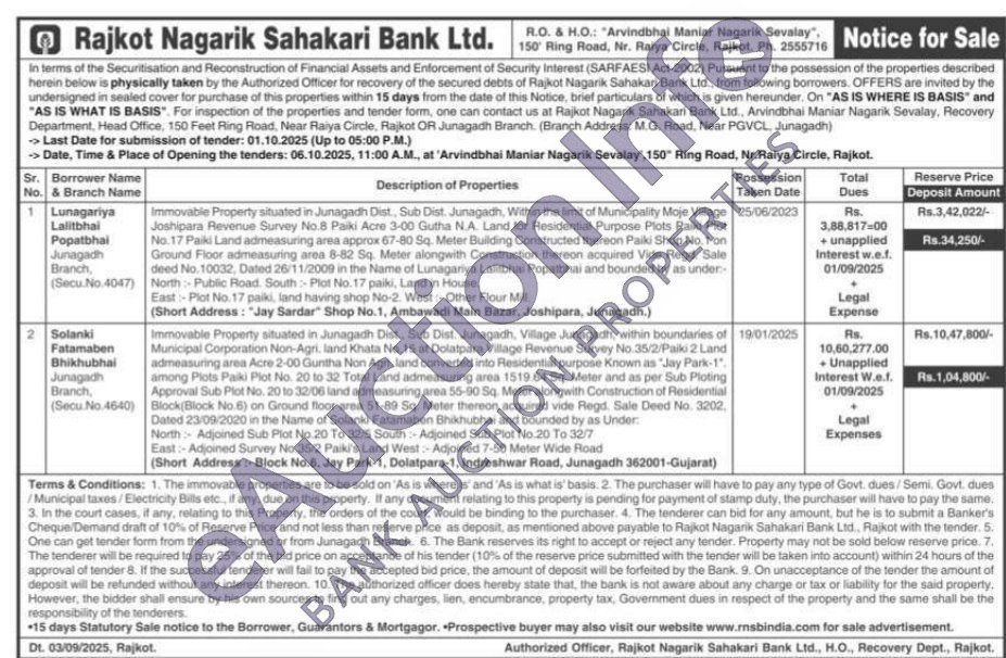 Immovable Property situated in Junagadh Dist., Sub Dist. Junagadh, Within the limit of Municipality Moje Village Joshipara Revenue Survey No.8 Paiki Acre 3-00 Gutha N.A. Land for Residential Purpose Plots Paiki Plot No.17 Paiki Land admeasuring area approx 67-80 Sq. Meter Building Constructed thereon Paiki Shop No.1 on Ground Floor admeasuring area 8-82 Sq. Meter alongwith Construction thereon acquired Vide Regd. Sale deed No. 10032, Dated 26/11/2009 in the Name of Lunagariya Lalitbhai Popalbhai
