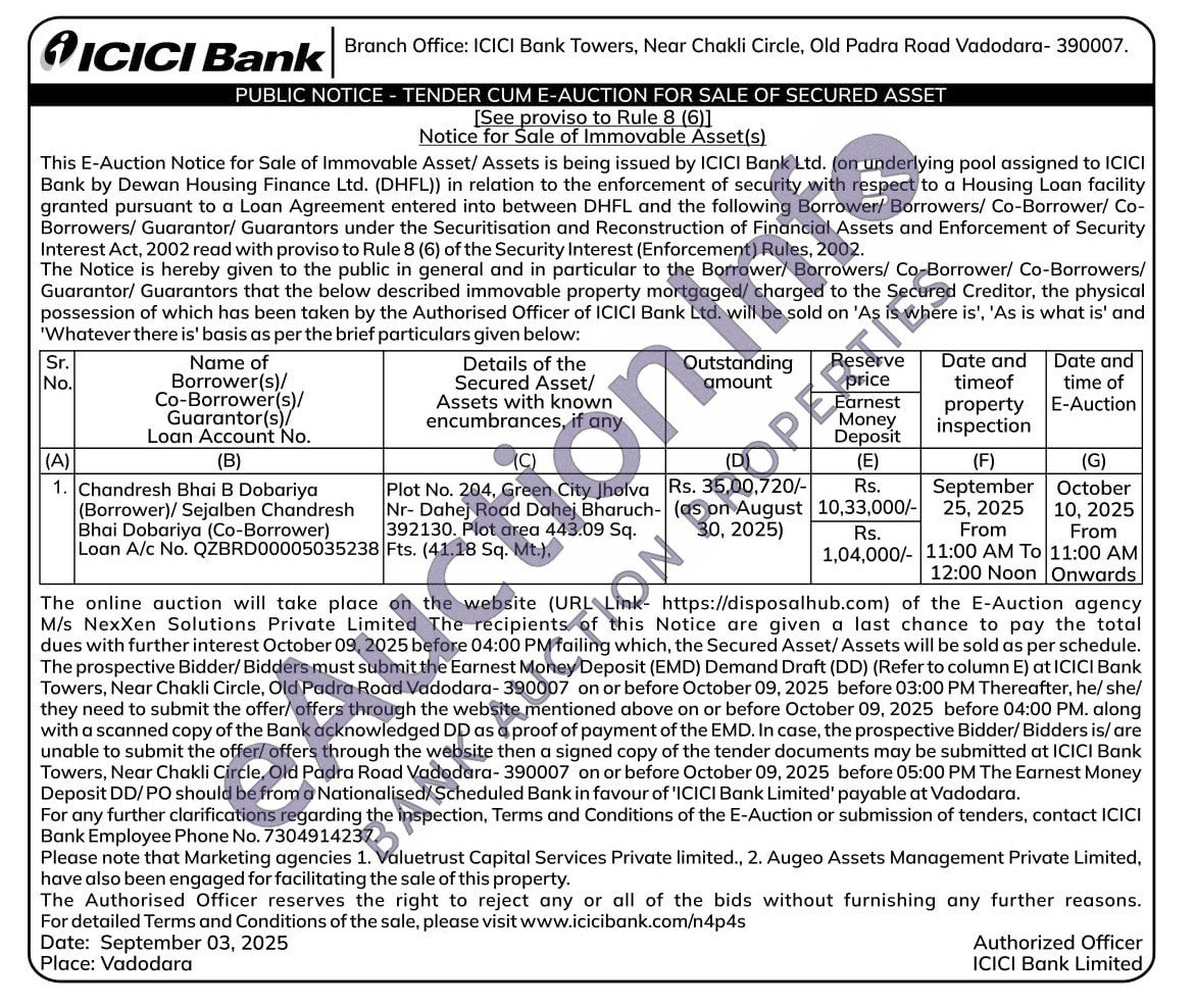 Plot No. 204, Green City Jholva Nr- Dahej Road Dahej Bharuch-392130. Plot area 443.09 Sq. Fts. (41.18 Sq. Mt.),