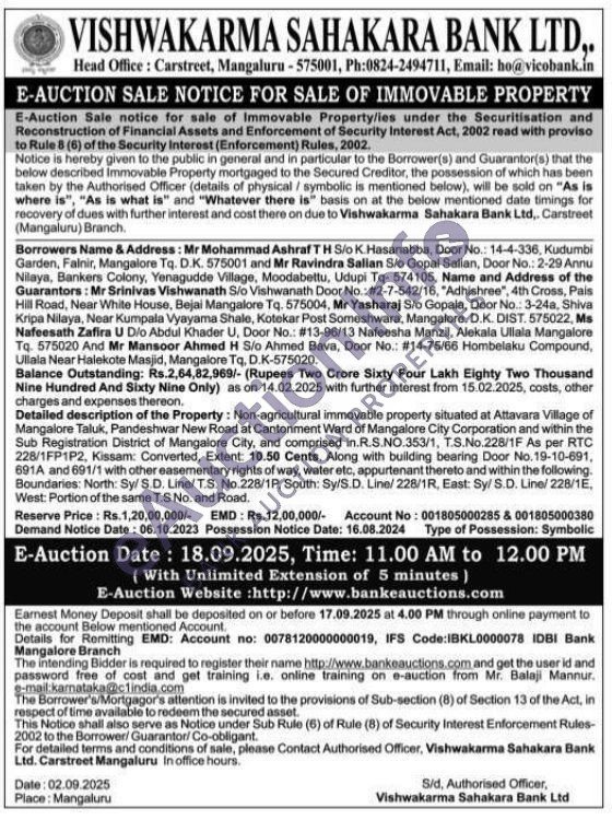Non-agricultural immovable property situated at Attavara Village of Mangalore Taluk, Pandeshwar New Road at Cantonment Ward of Mangalore City Corporation and within the Sub Registration District of Mangalore City, and comprised in.R.S.NO.353/1, T.S.No.228/1F As per RTC 228/1FP1P2, Kissam: Converted, Extent: 10.50 Cents. Along with building bearing Door No.19-10-691, 691A and 691/1 with other easementary rights of way, water etc, appurtenant thereto and within the following. Boundaries: North: Sy/S.D. Line/ T.S. No.228/1P, South: Sy/S.D. Line/228/1R, East: Sy/S.D. Line/228/1E, West: Portion of the same T.S No. and Road.