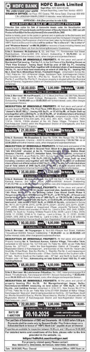 5) At that piece and parcel of Property bearing No. 4, Tamilarasi Avenue, Kakalur Village, Thiruvallur Taluk, comprised in Old Survey No 127/130 and 14, Palta No. 9644, as per Patta New Survey No. 127/1307, within the Sub-Registration District of Thiruvallur and Registration District of Kancheepuram, and bounded on the North By Vacant site South By- 15 feet Road, East By-Plot No. 3, West By-Plot No. 2, and measuring on fw East to Wext on the Northem side-27 feet, East to West on the Southern side-27 feet. North to South on the Eastern side-67 feet and North to South on the Western side 67 foet, Admeasuring an total Extent of land 1820 Sq. Ft with building thereon.